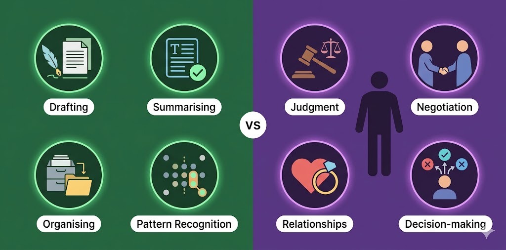 AI performs best when the task involves drafting, summarising, comparing, organising, restructuring, or identifying patterns in existing information. It struggles when the task depends heavily on judgment, human relationships, negotiation, or final decision-making.